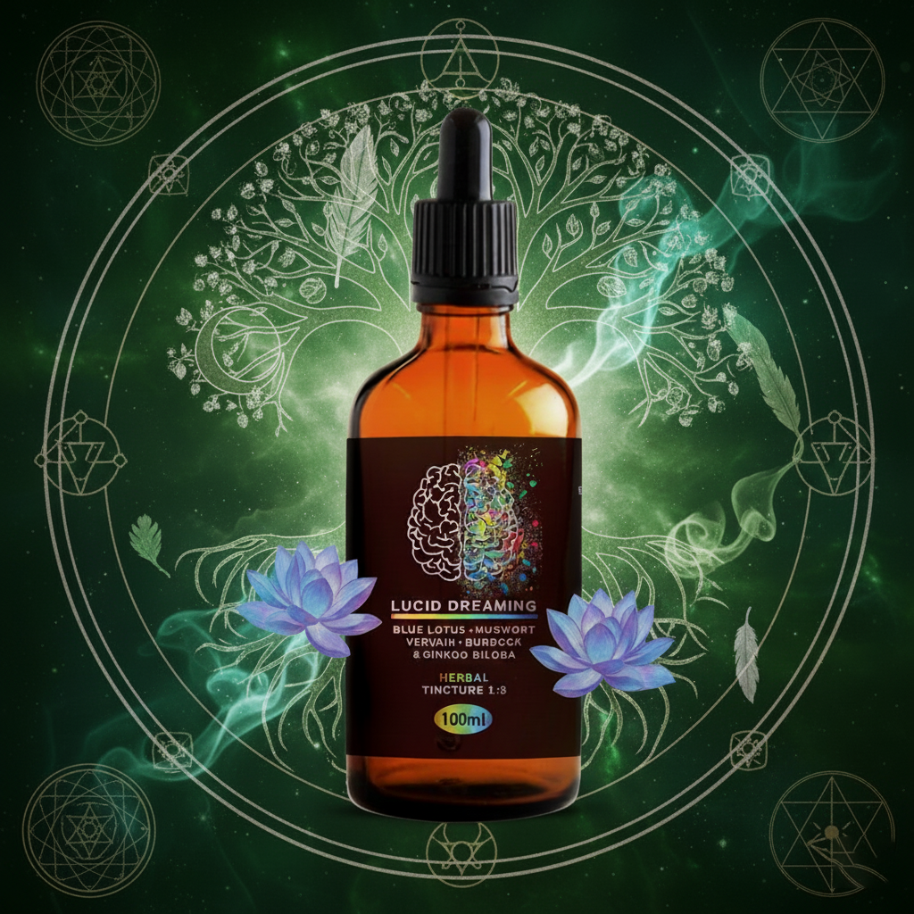 The Lucid Dreaming Tincture is a natural herbal blend designed to enhance dream recall and promote lucid dreaming. Crafted with organic ingredients, including mugwort, valerian root, and blue lotus, this tincture supports relaxation and deeper sleep, guiding you towards conscious dreaming experiences.