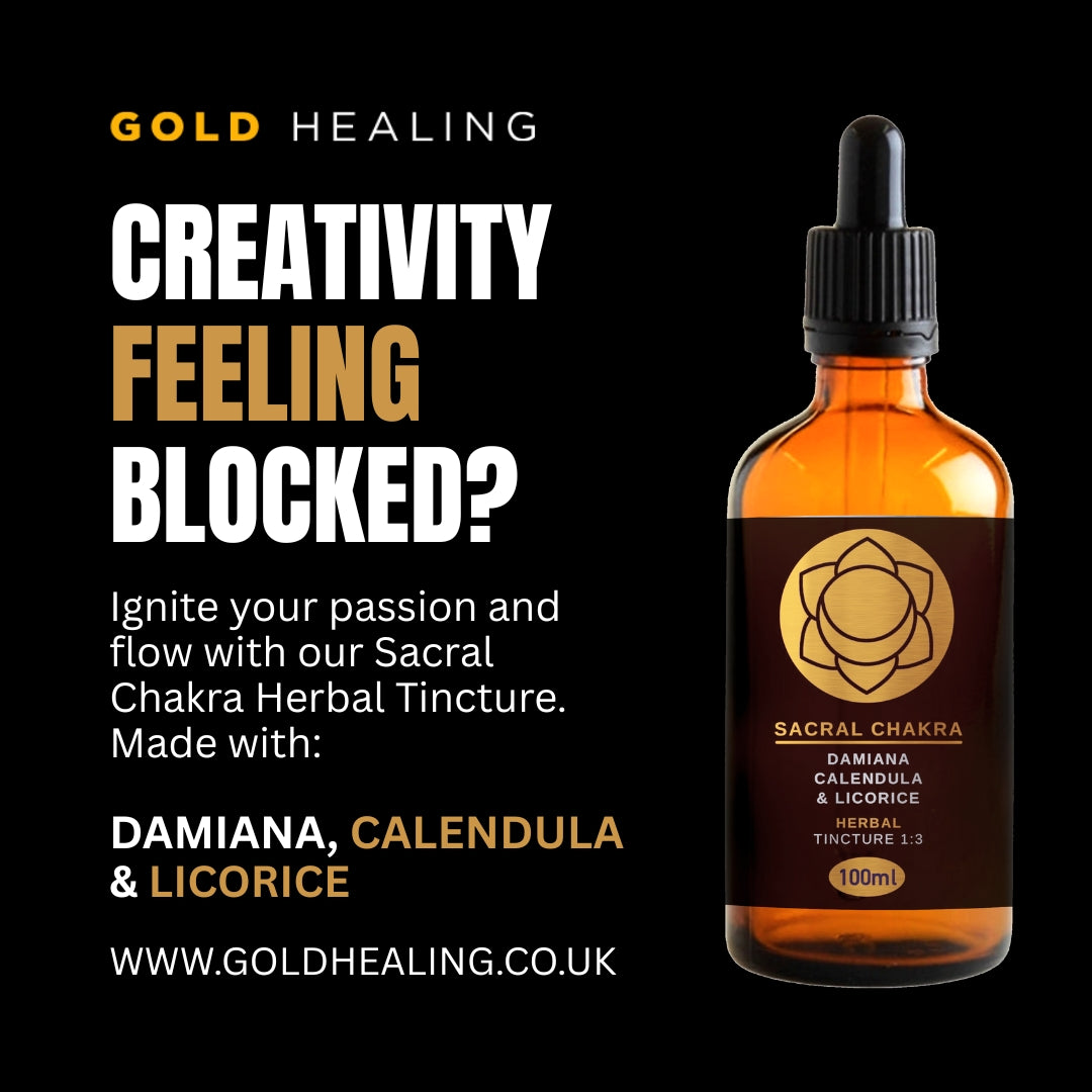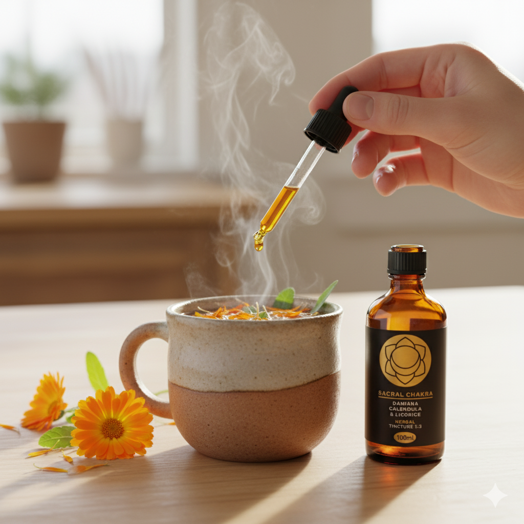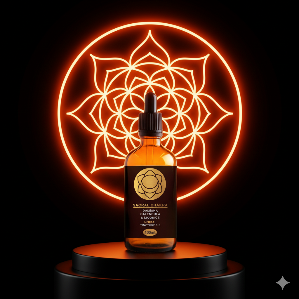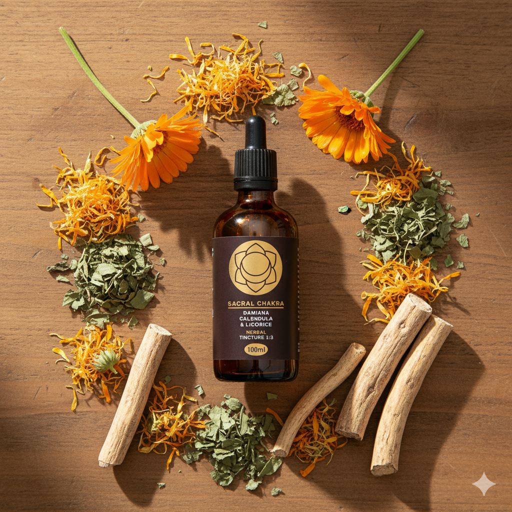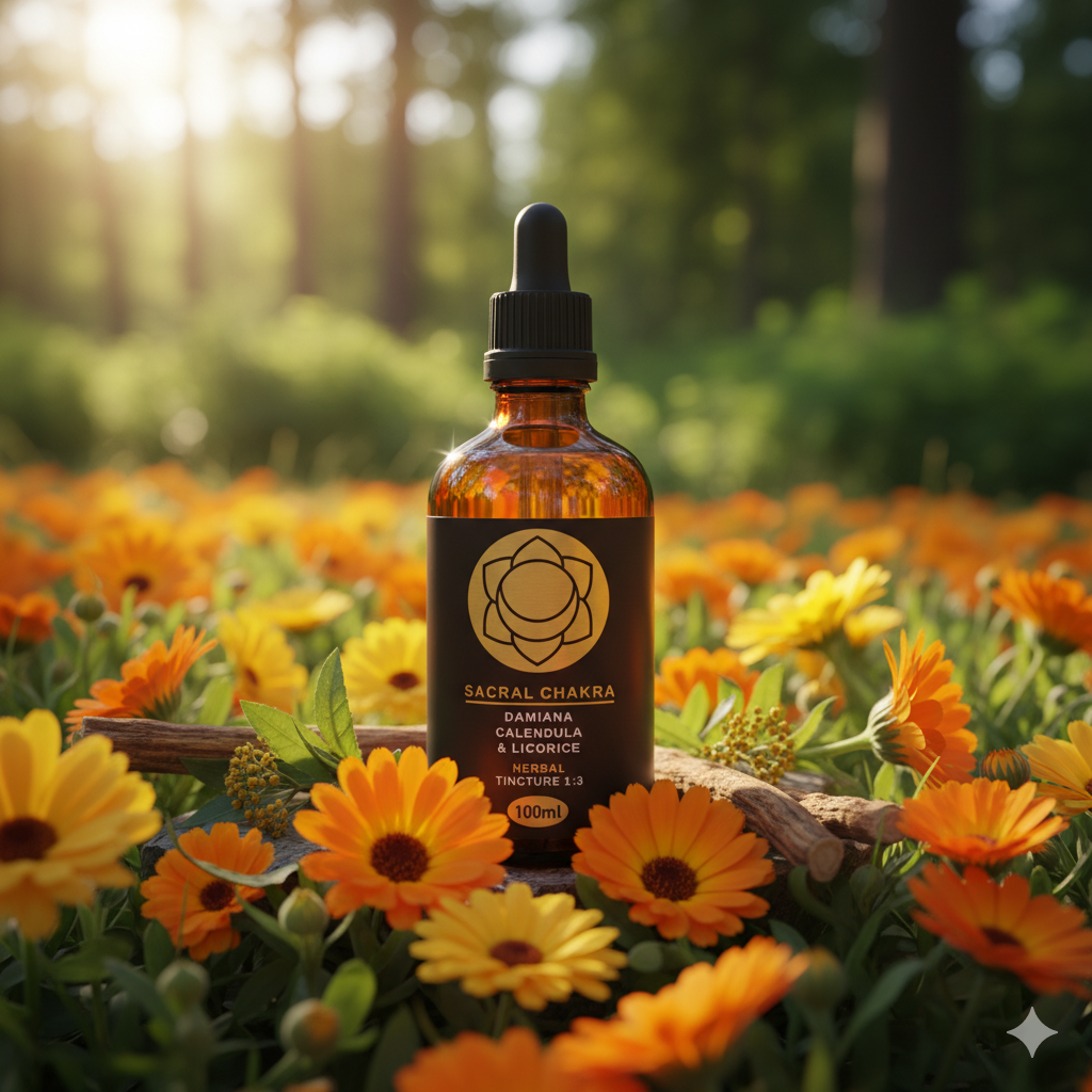 The Sacral Chakra Tincture is a natural herbal blend designed to restore balance to the Sacral Chakra. It supports creativity, sensuality, and emotional well-being using Damiana, Calendula, and Liquorice.