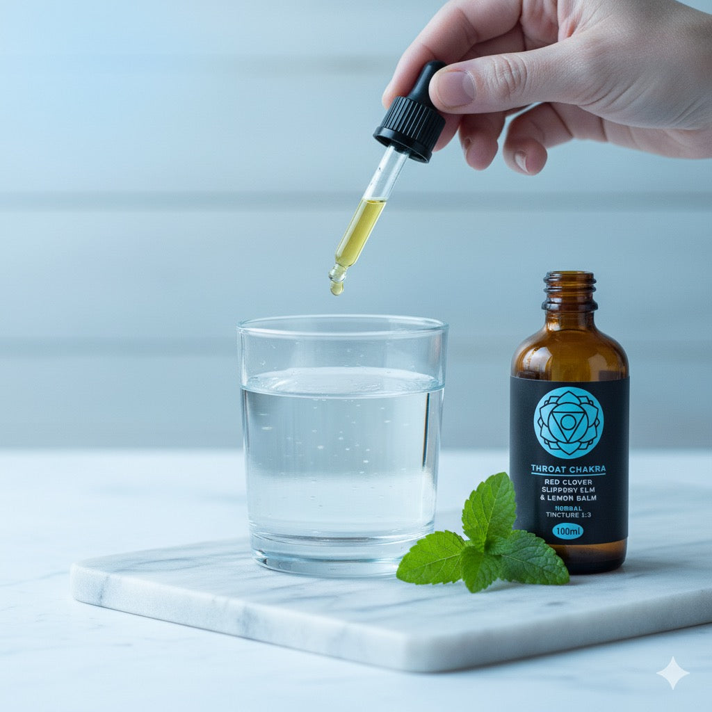 Find your voice with our Throat Chakra Tincture. Made with Red Clover, Slippery Elm, and Lemon Balm, this herbal blend supports clear expression, calm communication, and throat comfort.
